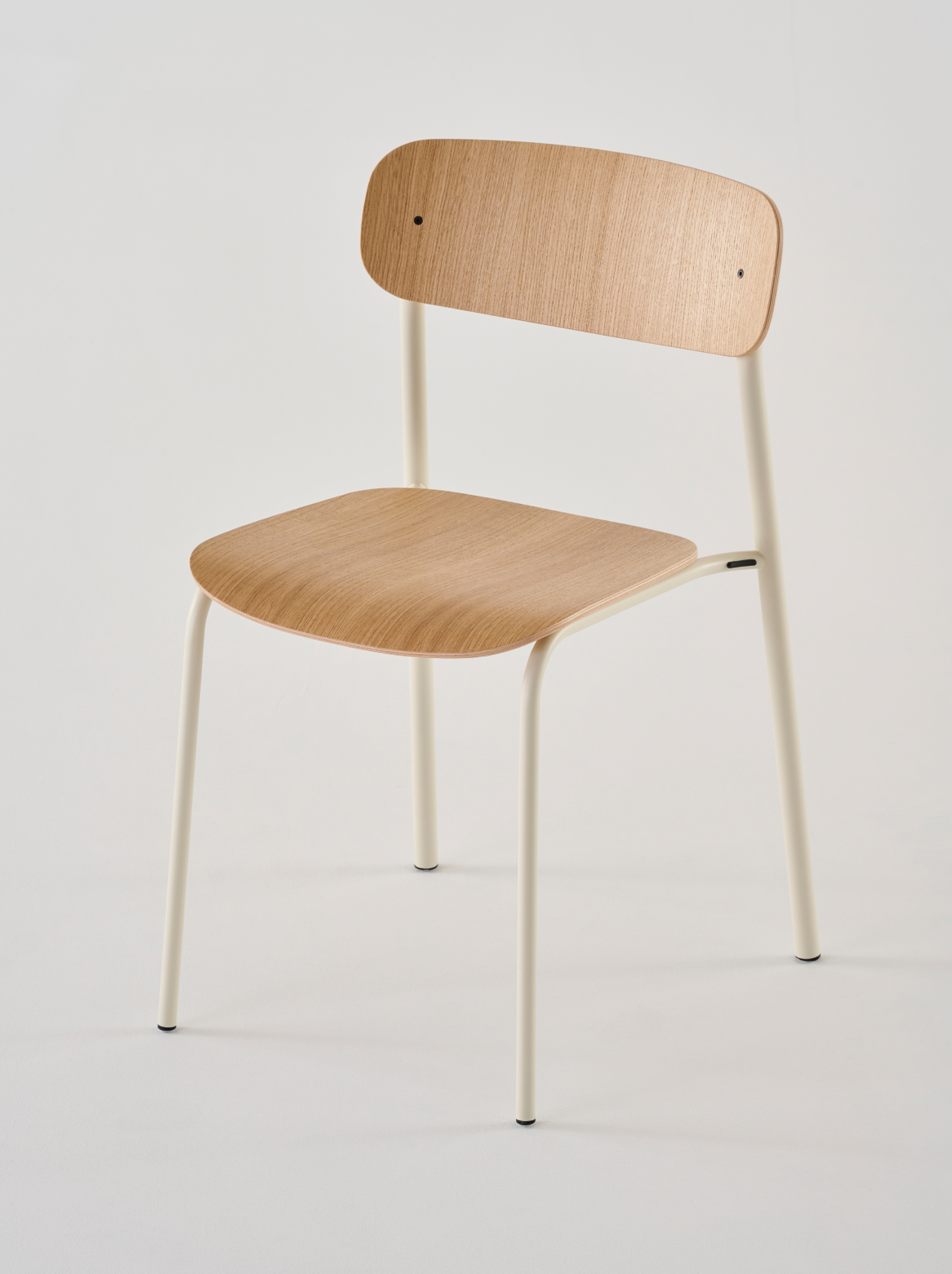 The S 243 is a stackable chair combining tubular steel and plywood, with subtle references to Thonet’s heritage. The thicker rear legs - 25mm in diameter and inspired by Thonet’s cantilever classics - bear most of the weight and ensure stability, while the slimmer front legs contribute to a visually lighter chair with a distinct character.